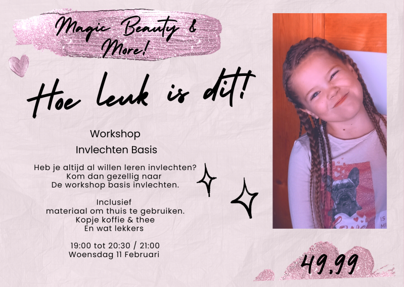 Ik geef workshops zodat ik je die avond de basis kan leren. Op deze avond krijg je een start pakketje mee naar huis zodat je lekker verder kan vlechten.